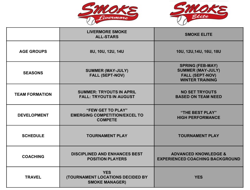 - Please note, to be eligible for our Livermore Smoke All-Star teams in the summer, your daughter is required to play either our Spring Recreational season OR our Livermore Smoke Interleague/Select "B" season. Tryouts for our Summer All-Star teams will be held the last weekend of April. if you are interested in coaching one of our teams, please email [email protected]